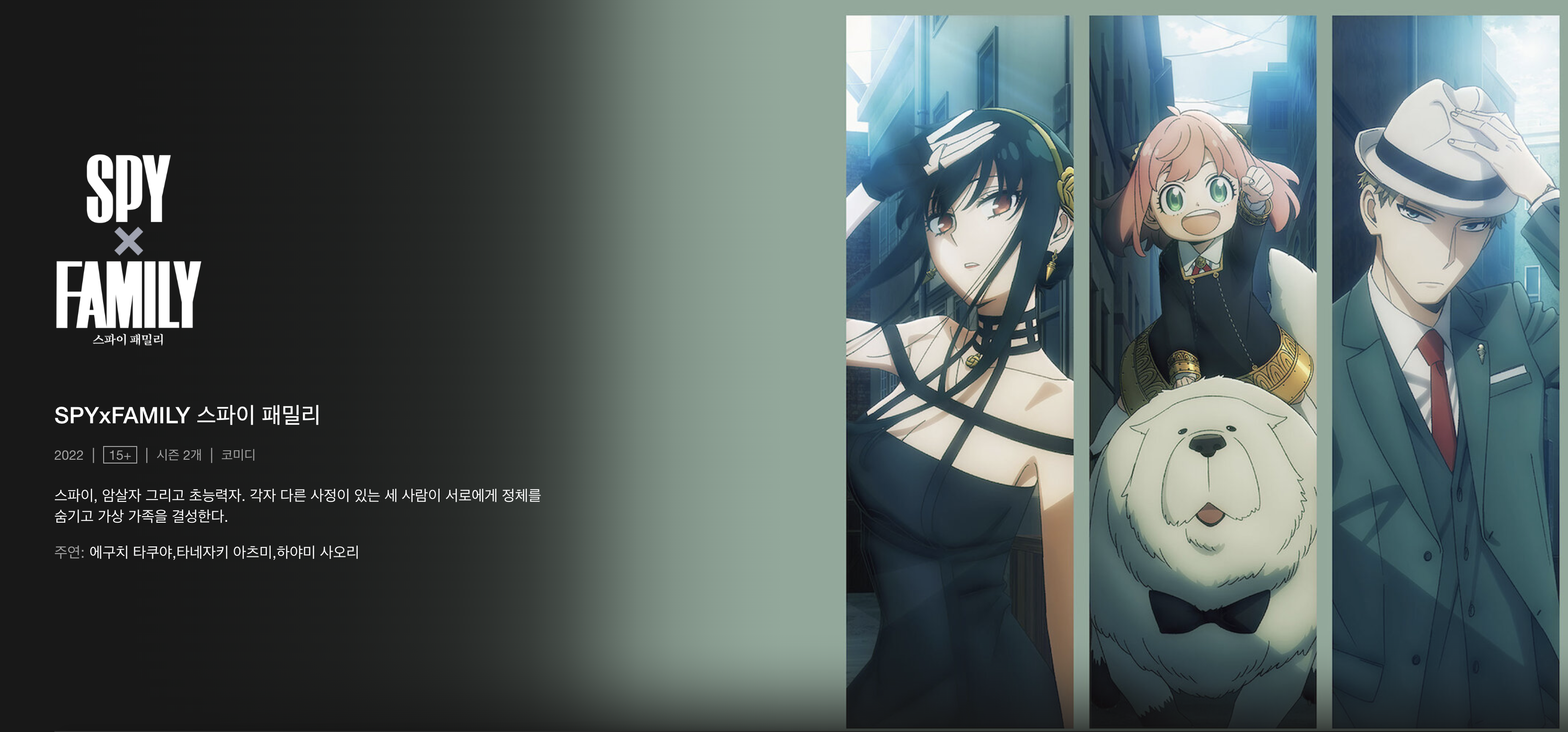 워낙에 유명한 작품입니다. 2022년 한 해를 빛낸 일본 애니메이션. 아냐라는 캐릭터의 귀여움과 코미디스러움은 이 애니메이션의 최대 매력 포인트입니다. ㅎㅎ