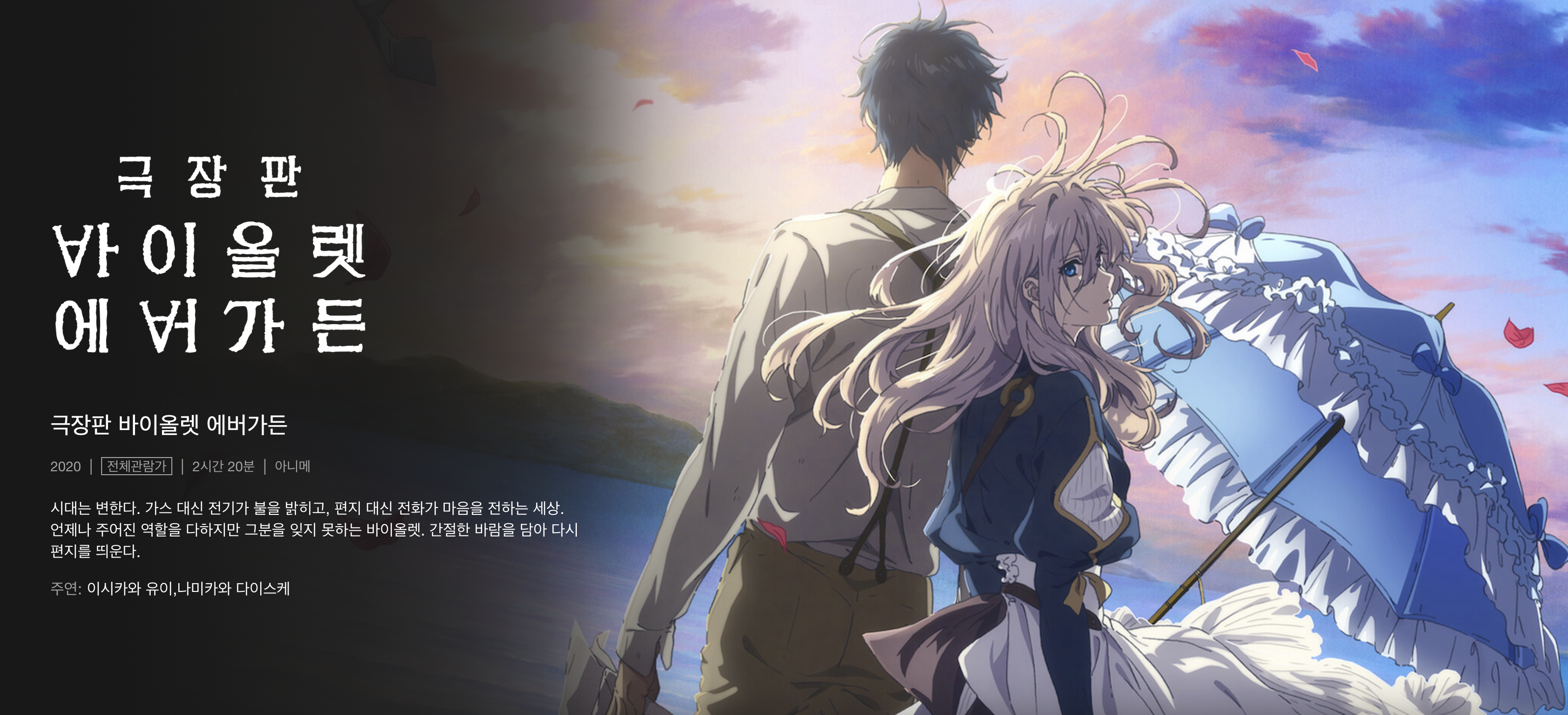 눈물 한 바가지 흘리고 나면 속은 후련해지는 애니메이션. 극장판도 꼭!! 보시는 걸 추천!! 특히 극장판 : 바이올렛 에버가든은 꼭 봐서 마무리를 하는 것을 추천합니다~